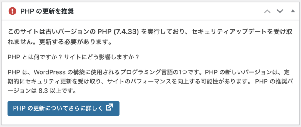 PHPのバージョンアップは、古いテーマやプラグインのままだと画面が真っ白になることがあるので、「プラグイン・テーマ更新 → PHP切り替え」の順序が鉄則です。