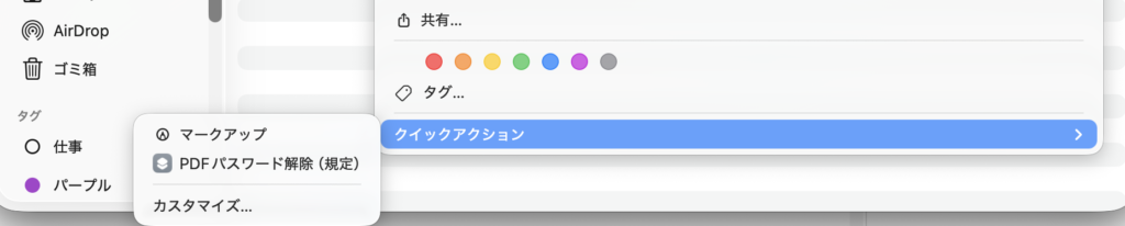 設定が終われば、FinderでPDFを右クリックするだけ。 「クイックアクション」メニューの中に、作った「PDFパスワード解除」ボタンが現れます!